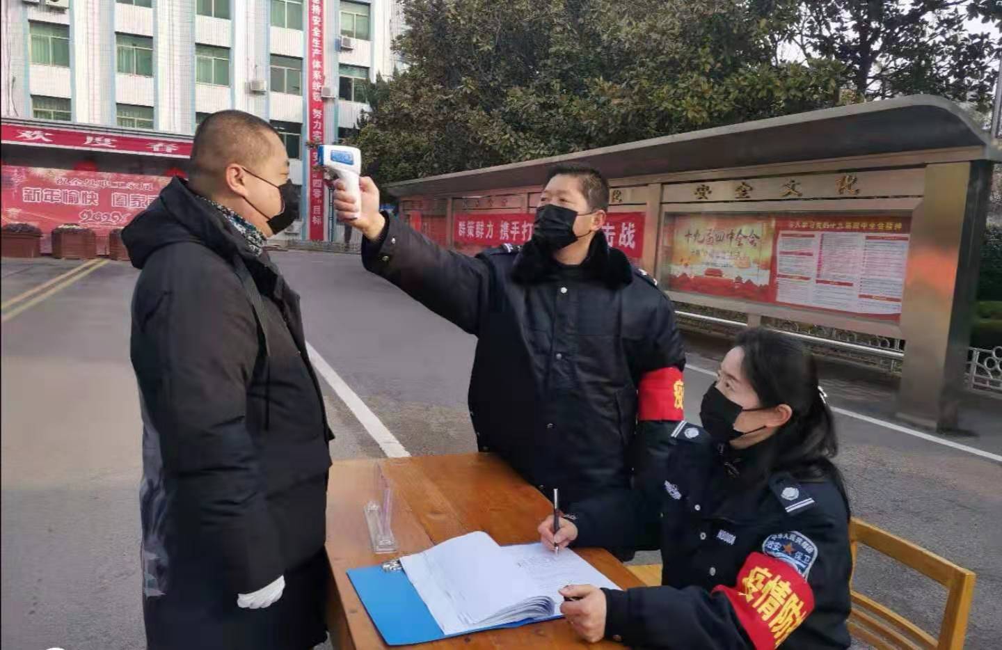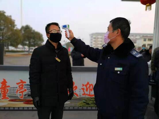“董部長,請下車測體溫。”物業分公司部長董昌軍剛把車開到該處機關大門口,就被保衛人員楊瑞廷攔下了。“你們頂頭上司你也敢攔?”旁邊有人打趣道。“一車一檢,一人一登記、測體溫,我們是按門衛制度辦事,堅決不能漏過一車一人,不是假期值班人員,其他人現在還不讓進呢。”楊瑞廷解釋說。