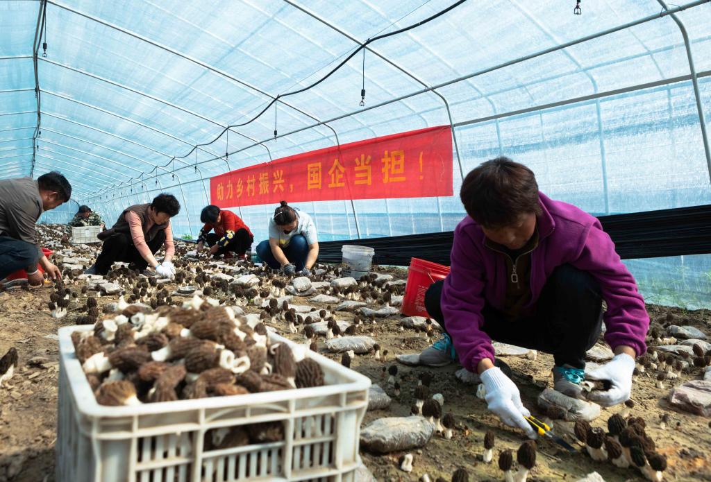 3月29日,在淮北礦業(yè)集團援建的碭山縣曹莊鎮(zhèn)53畝羊肚菌種植基地,村民正忙著采摘、搬運成熟的羊肚菌,一派豐收繁忙景象。