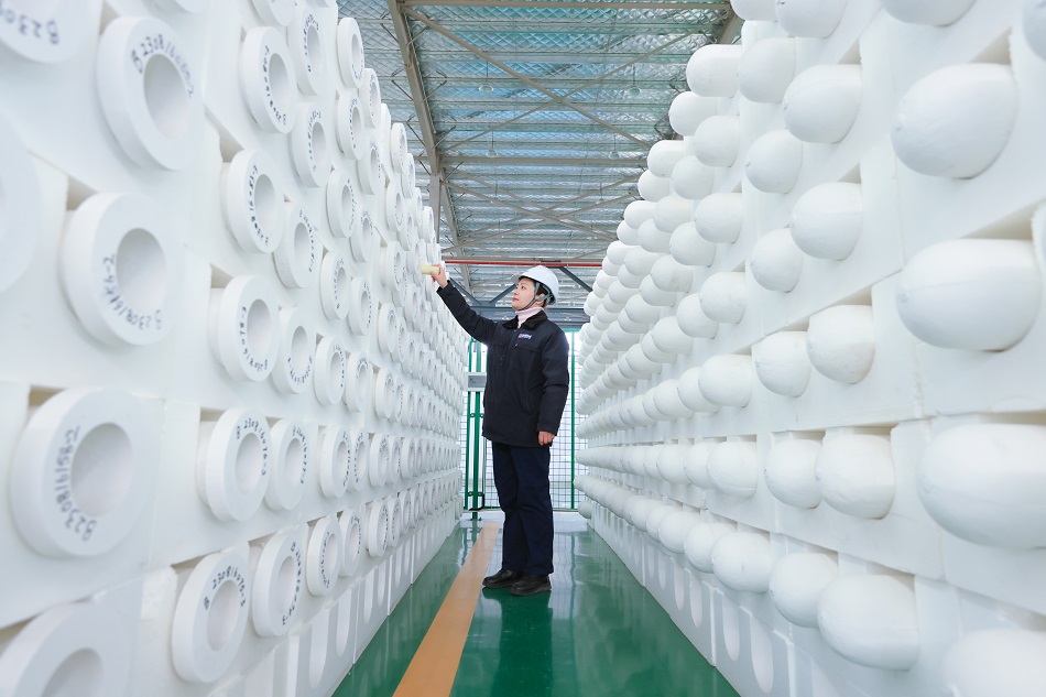 紫朔環境公司一名工人正在檢查生產的陶瓷濾管質量
