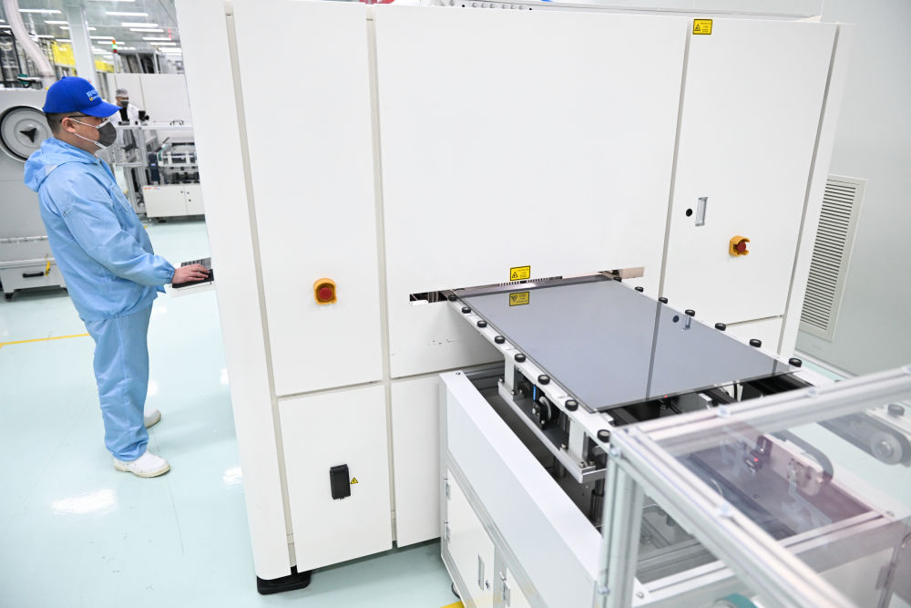 2024年2月29日,在位于江蘇省無錫市錫山區(qū)的極電光能有限公司智能生產(chǎn)車間,鈣鈦礦光伏組件正在自動化生產(chǎn)線上進行激光劃刻工藝。新華社記者 季春鵬 攝