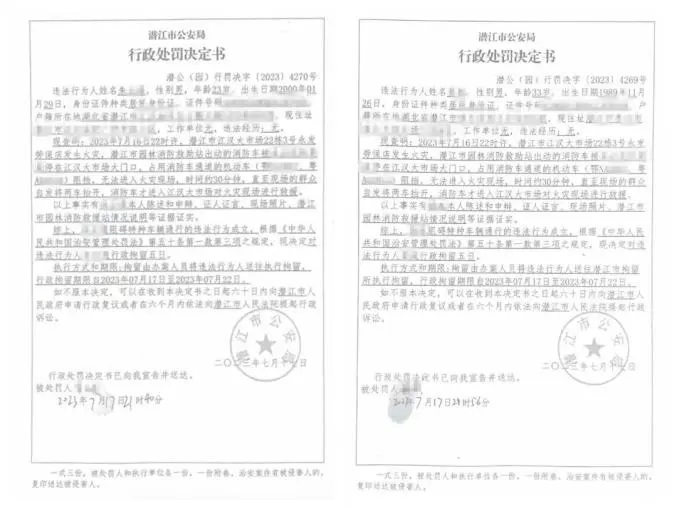 2023年7月,湖北潛江一市場門面房夜間發生火災,兩輛私家車違規停在消防通道上,違停車輛車主不能及時到場,致使消防救援車輛無法進入,情急之下,現場群眾合力將違停車輛抬離。相關部門對兩位私家車主均處以行政拘留五日的處罰。