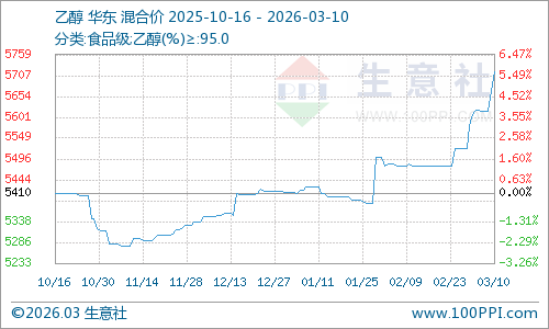 據(jù)生意社商品行情分析系統(tǒng),3月初至今,國內(nèi)乙醇價格上漲至5716元/噸,周期內(nèi)價格上漲3.48%,環(huán)比上漲4.23%,同比上漲7.70%。國內(nèi)發(fā)酵乙醇價格上漲主要受以下幾方面因素推動:多地主力工廠報價上漲,成本、供應(yīng)且下游訂單量增加共同支撐下乙醇價格持續(xù)上漲。